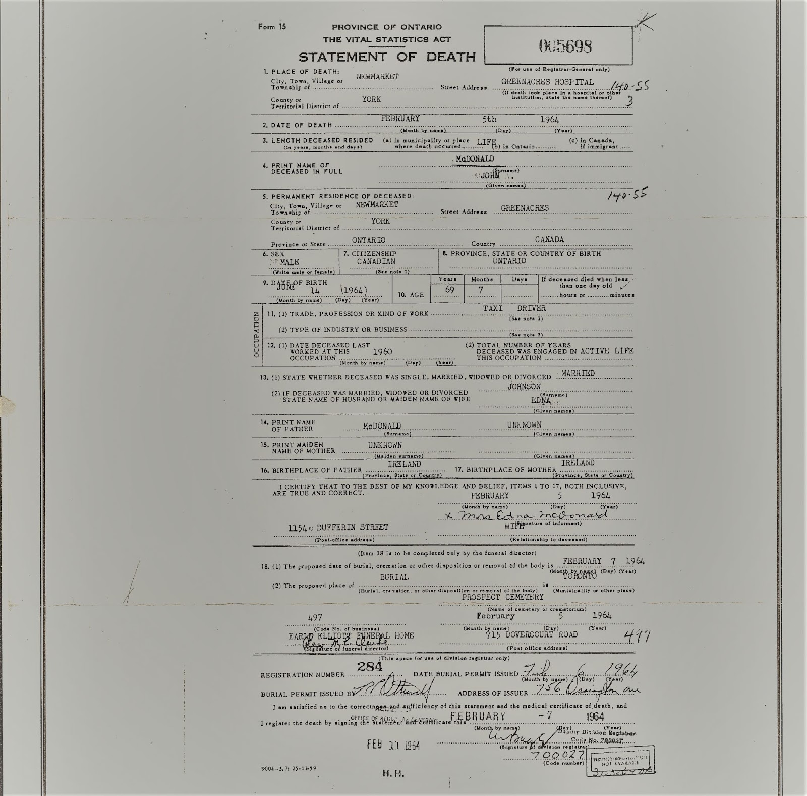John dies in Greenacres Nursing Home in Newmarket, Ontario. Information obtained from John's death certificate. Edna was the informant, and stated that she did not know his parents' names, only that they were born in Ireland. Which says to me she never met them.
